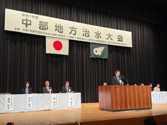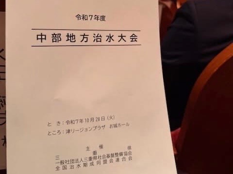 令和7年度中部地方治水大会が三重県津市で開催され、中部直轄河川治水期成同盟会の監事として出席しました。本大会は、三重県・長野県・岐阜県・静岡県・愛知県の5県の関係者が集まり、治水事業を計画的かつ着実に行うため、提言や決議を行う場であります。また、三重大学葛葉泰久教授による「気候変化の時代における治水政策」と題した記念講演がありました。引き続き、住民生活の安定と地域発展のため、要望活動等に努めてまいります。