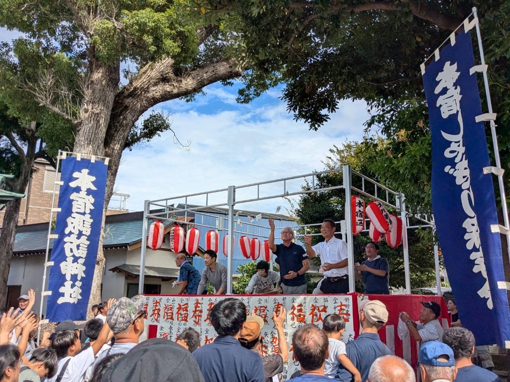 まだまだ暑さの残る秋晴れのもと、本宿諏訪神社祭典が催行され、鏡開きと投げ餅に参加させて頂きました。境内では、しゃぎり囃子の披露をはじめ、ビンゴゲームや福引抽選会などでたくさんの方が集まり、大変賑やかなお祭りでした。このような地域の伝統文化であるお祭りがいつまでもつづくよう願っています。準備をされました町内会の皆さん、お疲れさまでした。