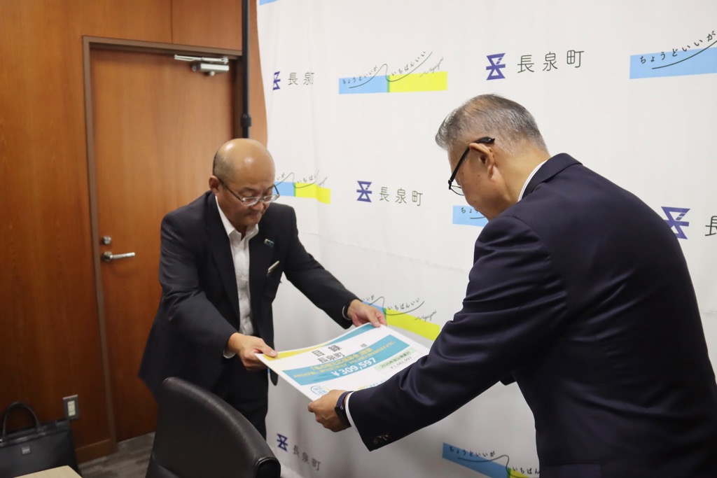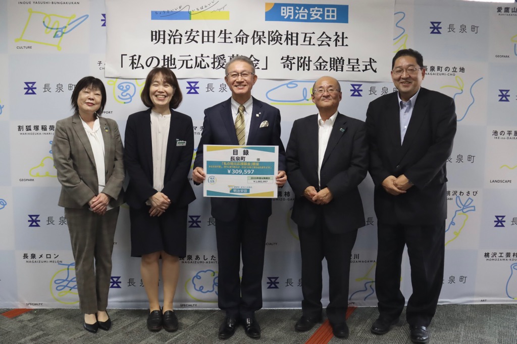 明治安田生命保険相互会社様から「私の地元応援募金」として、御社と御社従業員の皆さまからの募金を寄附していただきました。この御寄附は、御社の「地元の元気プロジェクト」の一環として地域住民の健康づくりや暮らしの充実に向けた一助になればとの思いだそうです。寄付金につきましては現在設置しています「桃沢グラウンド電光スコアボード」に充てさせていただきます。ありがとうございました。