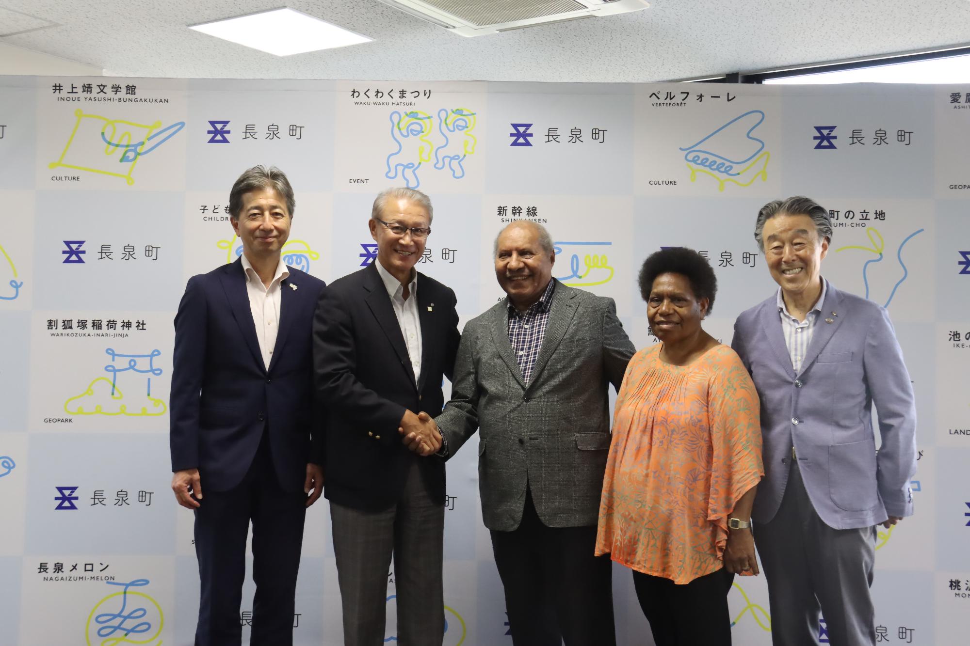「駐日パプアニューギニア大使」のサミュエル・アバル様と奥様のアンナ様が表敬訪問に来て下さいました。このご来庁は、「米山梅吉記念館」の副理事長多田幸雄様がかつてパリ留学されていた時代に、アバル大使と留学仲間だったそうで、そのご縁から、多田様は、パプアニューギニア大使館の名誉特別顧問に就任されており、今回の表敬訪問となりました。町内の鮎壺公園等にもお寄りいただきました。