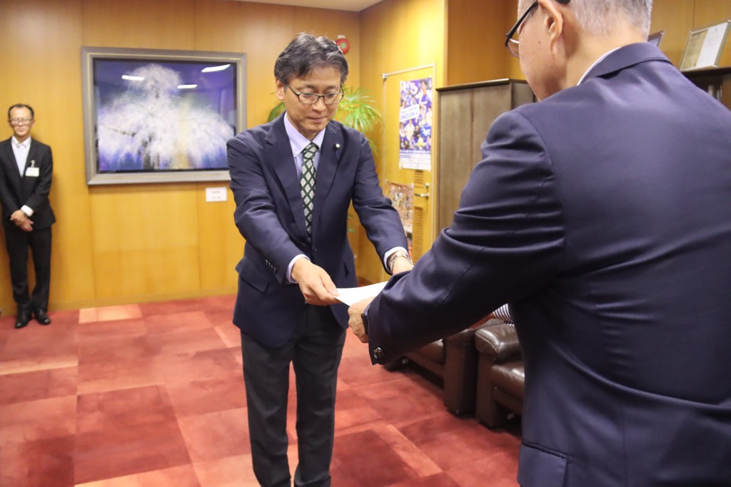 町議会9月定例会におきまして、議会議員選出の長泉町監査委員としまして、植松英樹様を選任する議案の同意を受けましたので、委嘱状の交付をさせていただきました。是非、予算決算のチェックをはじめ、事務事業の効率性、妥当性など新たな視点で検証いただければと思います。