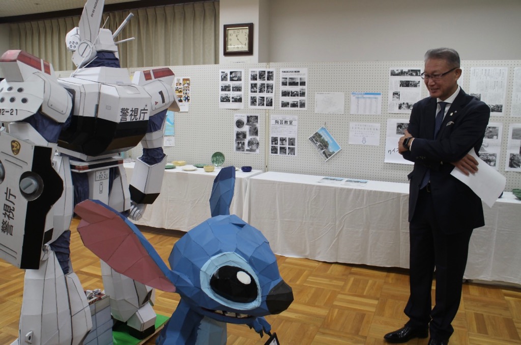 南部地区センターにおいて竹原区民文化祭が開催されました。室外では、お米3kgや野菜などの販売がなされ、販売開始と同時に多くの区民の方が購入に訪れておりました。室内では、陶芸作品や絵画などが展示され、今年度も段ボールでつくられたペーパークラフトは、1/4等身大の作品であり、とても印象深い展示でした。 また、豚汁などがふるまわれており、2階では「たけはら吹奏楽団」の演奏も行われていました。心配された天候でしたが、多くの区民が訪れ大変賑わっておりました。