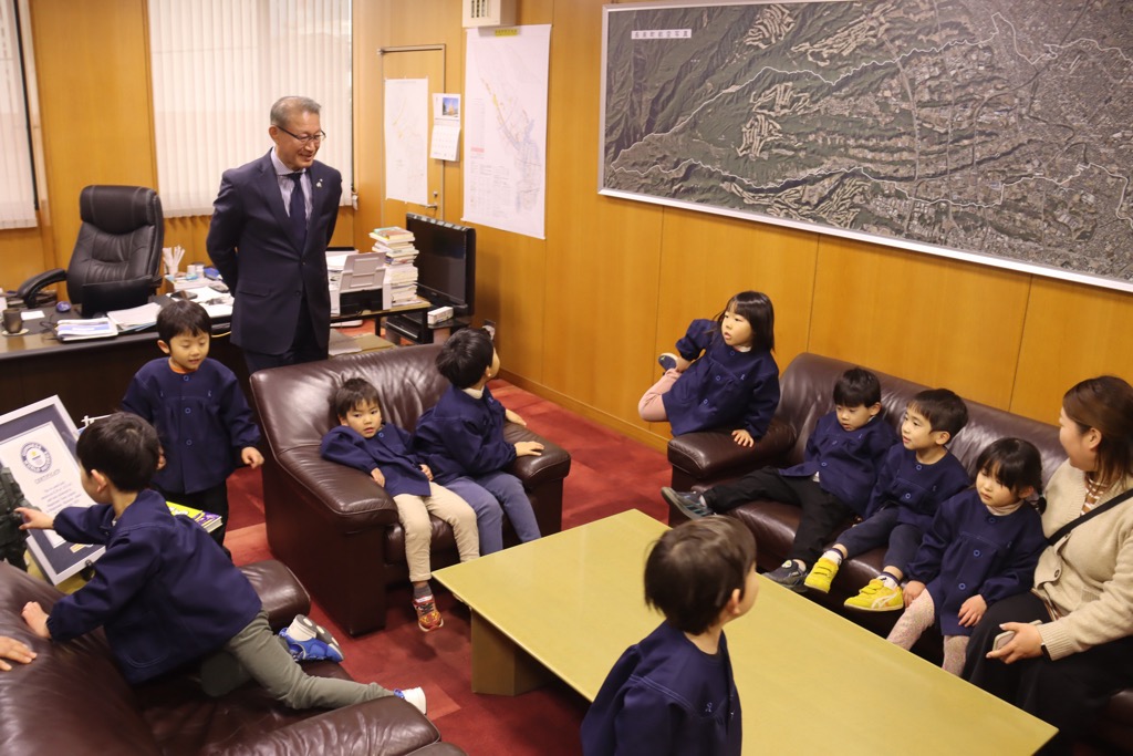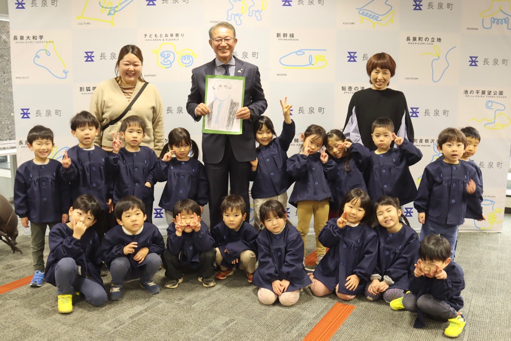 町では、町有林の間伐材を使った名前入りの箸を、箸を使い始める時期の4歳児へ、世界に一つだけの「はじめてのマイ箸」をお届けするプロジェクトを行っています。昨年、贈呈式を行った「あまね こども園」の園児の皆さんが、お礼のために表敬訪問に来てくださいました。お礼の手紙や折り紙もたくさん戴き町長室が笑顔で溢れました