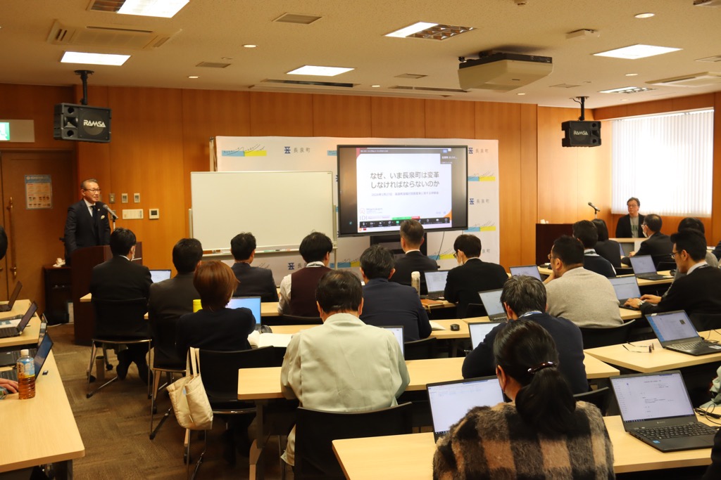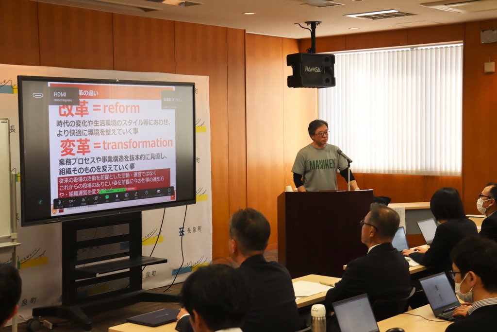 町では、厳しい財政状況等を受け、行財政変革の取り組みをスタートさせました。町の全職員がこの状況を正しく理解し“なぜ変革をしなければならないのか”について共通の認識を持つことが重要であることから、講師に長泉町行財政変革会議の委員であり、早稲田大学デモクラシー創造研究所 地域経営部会長、元徳島県川島町長の「中村 健」氏を招き、 “変革”について学びました。研修会には町議会議員の皆さまもご参加くださいました。