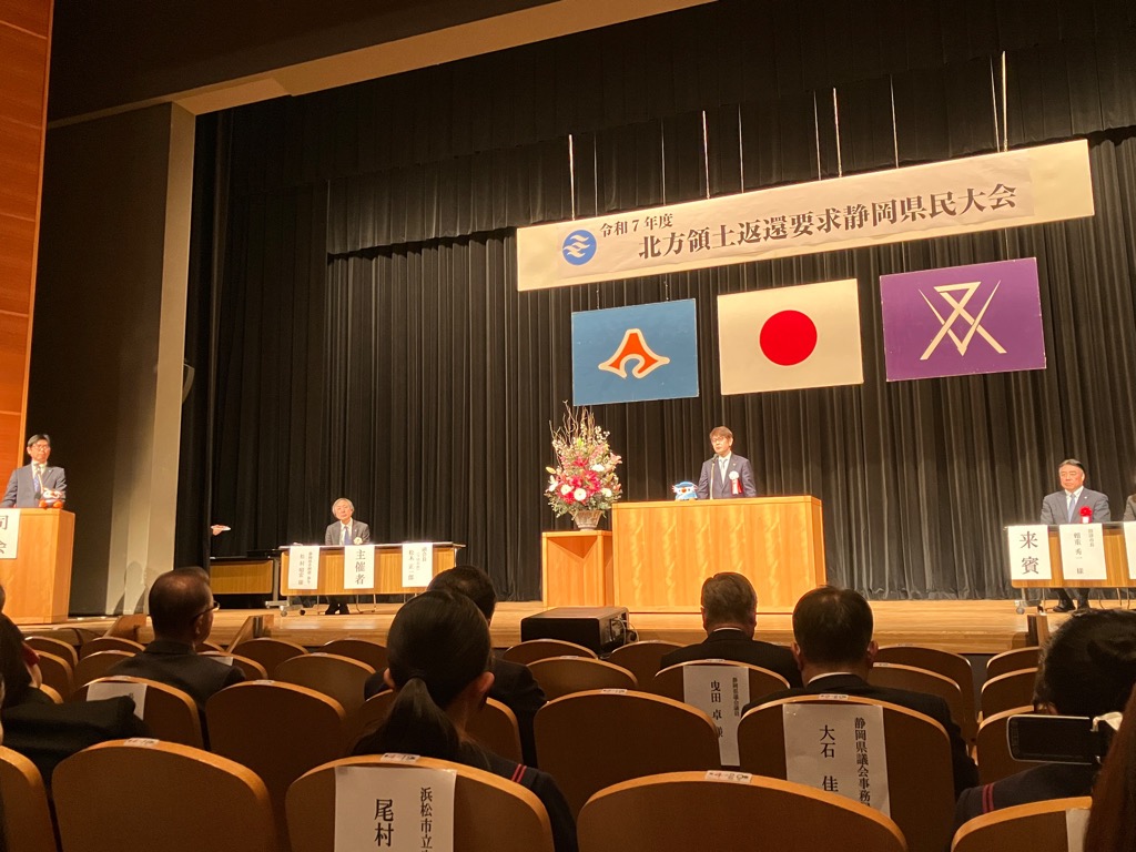 沼津市民文化センターにおいて、令和7年度「北方領土返還要求静岡県民大会」が開催され出席させていただきました。北海道の北東洋上に連なる「歯舞群島、色丹島、国後島、択捉島」は、日本固有の領土です。一日も早い返還を実現するためには、1人ひとりがこの問題への関心と理解を深め、返還に向けた強い意思を共有することが大切です。参加者皆さんのより一層の結集が図られました。