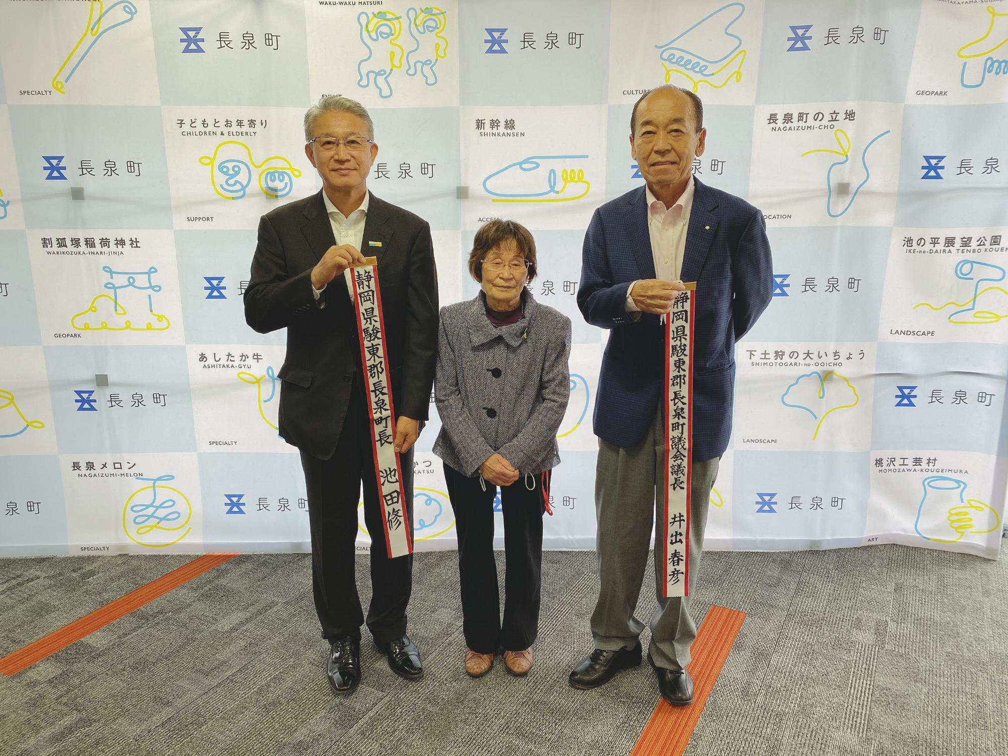 核兵器のない平和な世界への願いを込めて、「反核平和自治体の鎖のペナント」を町議会議長と共に、原水爆禁止平和行進静岡県実行委員会に託しました。