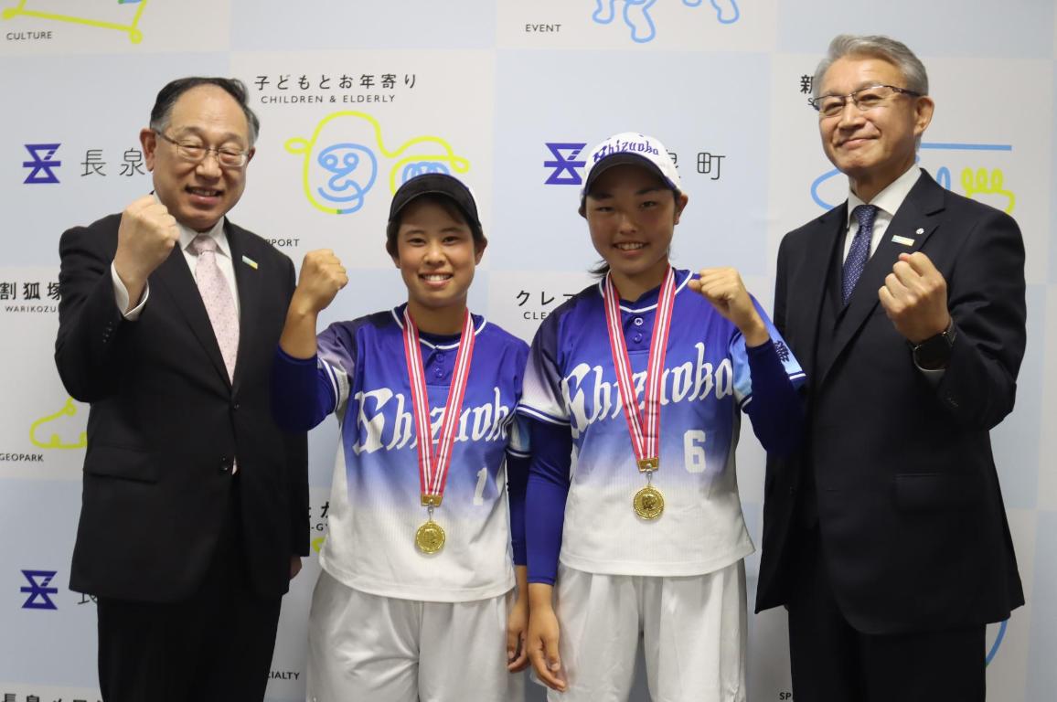 令和5年4月6日(木曜日)、3月に開催された第19回都道府県対抗全日本中学生女子大会(ソフトボール)において優勝した静岡県選抜チームのメンバーである、小山釉已さん(北中3年)、加藤名穂さん(長泉中3年)が町に報告に来てくれました。