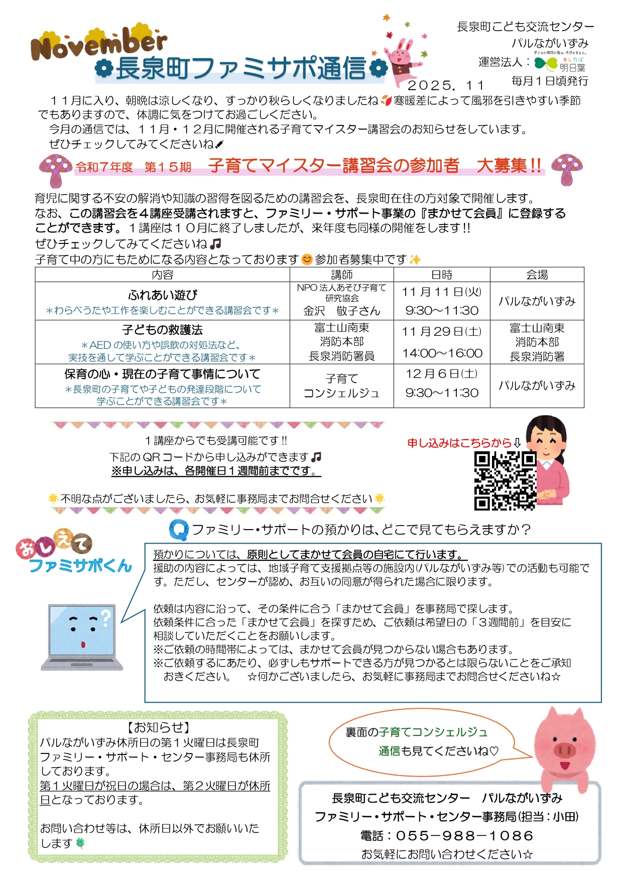 ファミサポ通信 Tweet 更新日:2025年01月30日 ファミリー・サポート・センターの活動内容等を掲載します。 ファミサポ通信 11月ファミサポ通信 (PDFファイル: 4.3MB) この記事に関するお問い合わせ先 こども交流センター パルながいずみ(こども未来課)〒411-0942静岡県駿東郡長泉町中土狩539番地(フレスポ長泉A棟2階)電話番号:055-988-1086 ファックス :055-988-7786お問い合わせはこちらから