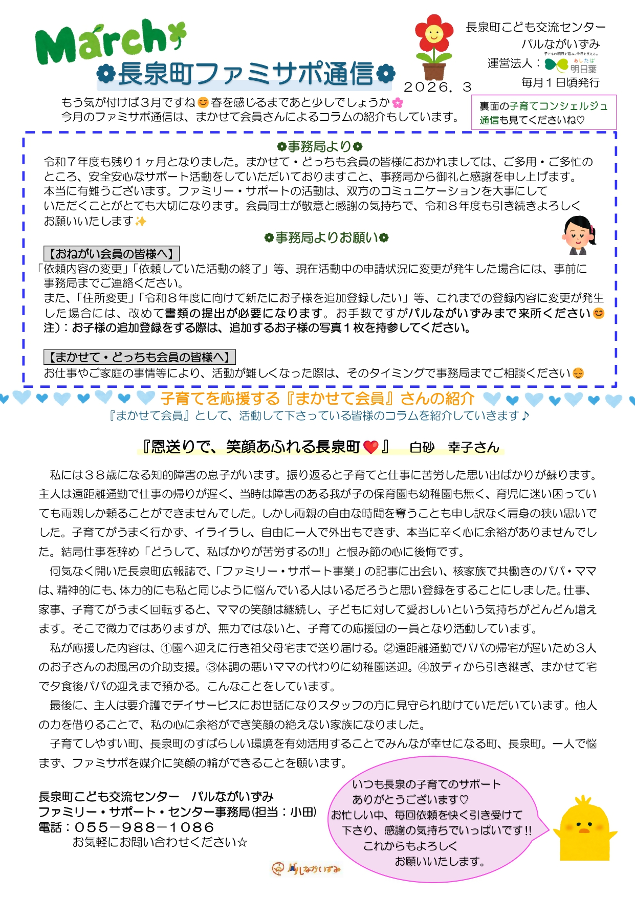 ファミサポ通信 Tweet 更新日:2025年12月26日 ファミリー・サポート・センターの活動内容等を掲載します。 ファミサポ通信 3月ファミサポ通信 (PDFファイル: 4.1MB) この記事に関するお問い合わせ先 こども交流センター パルながいずみ(こども未来課)〒411-0942静岡県駿東郡長泉町中土狩539番地(フレスポ長泉A棟2階)電話番号:055-988-1086 ファックス :055-988-7786お問い合わせはこちらから
