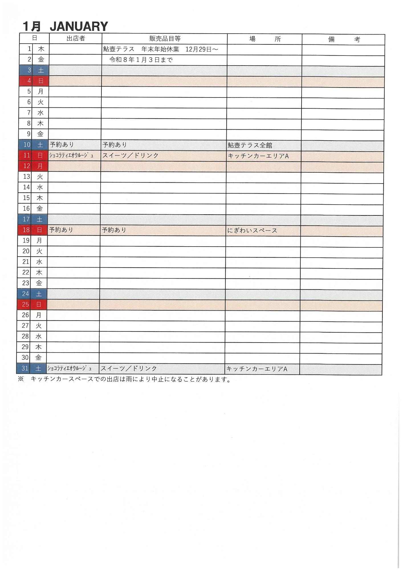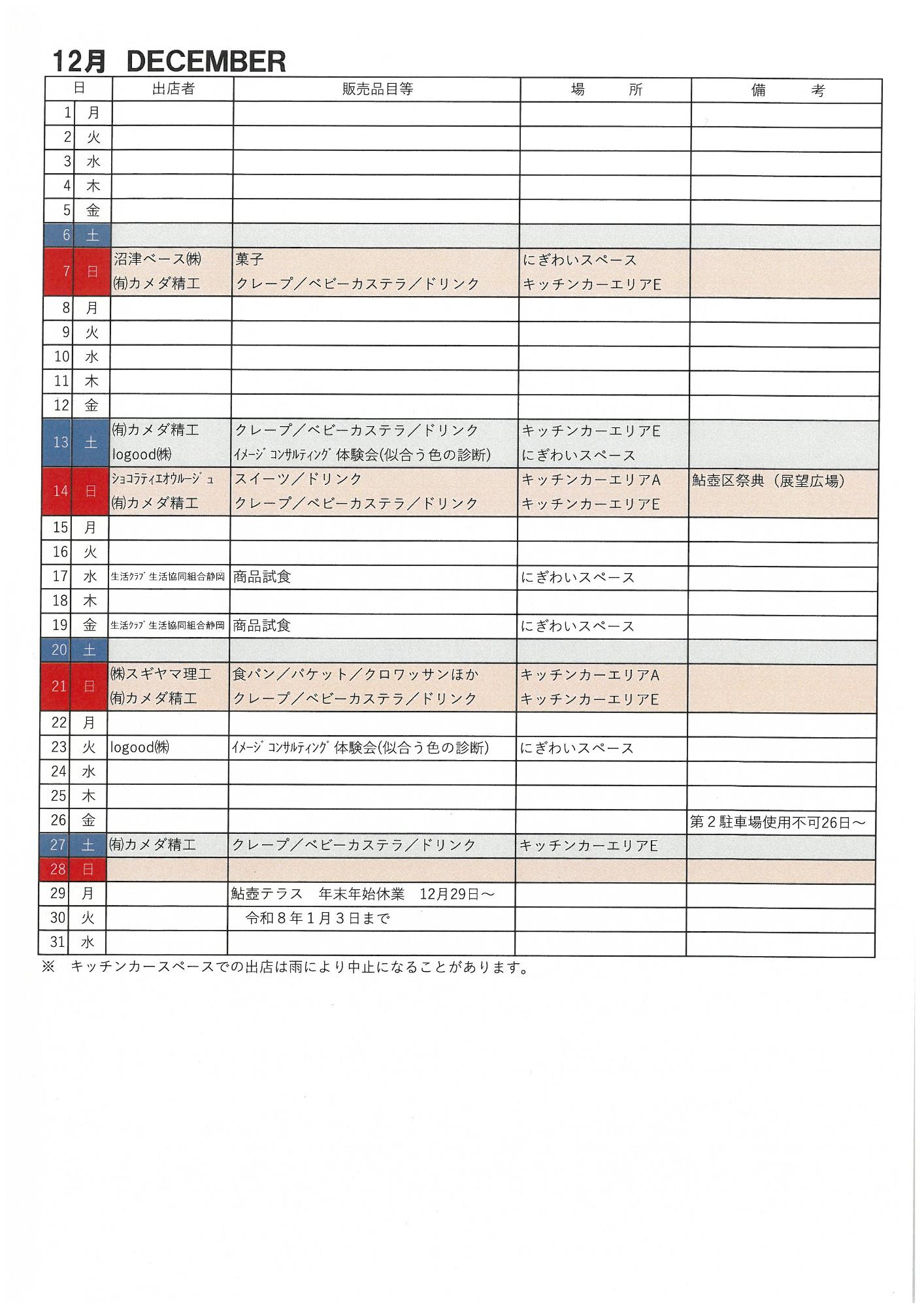 令和7年12月・令和8年1月 鮎壺公園 キッチンカー出店等の予定
