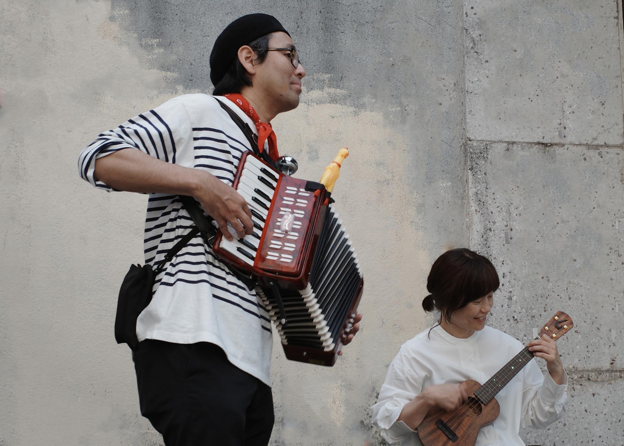 絵本作家&音楽家のMotomitsu Maehara(ミニアコーディオン)と絵本の店キルヤの店主 Noriko Hoshino(ウクレレ)によるユニット「アコレレ」。浜松を拠点に各地のカフェ、ギャラリー、美術館、マルシェ、路上などで活動。絵本の世界観とパリの路上を感じる、楽しくゆるりと踊れるオリジナル曲を中心に、子どもからお年寄りまで、だれもが笑顔になる音色とリズムを奏でる。また絵本と詩の朗読ユニットとしても活動中。