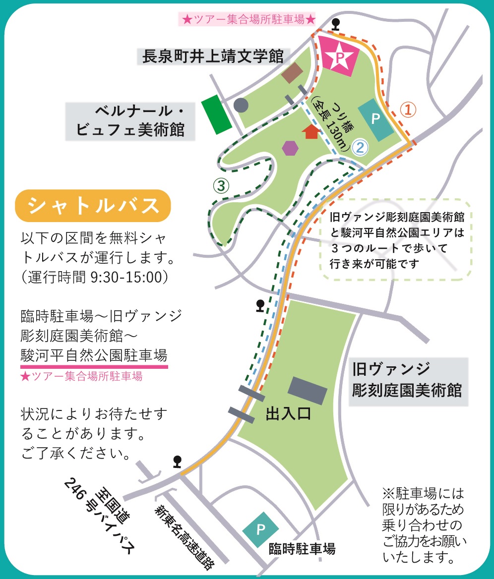 開催場所 クレマチスの丘(旧ヴァンジ彫刻庭園美術館、ベルナール・ビュフェ美術館、長泉町井上靖文学館、駿河平自然公園)