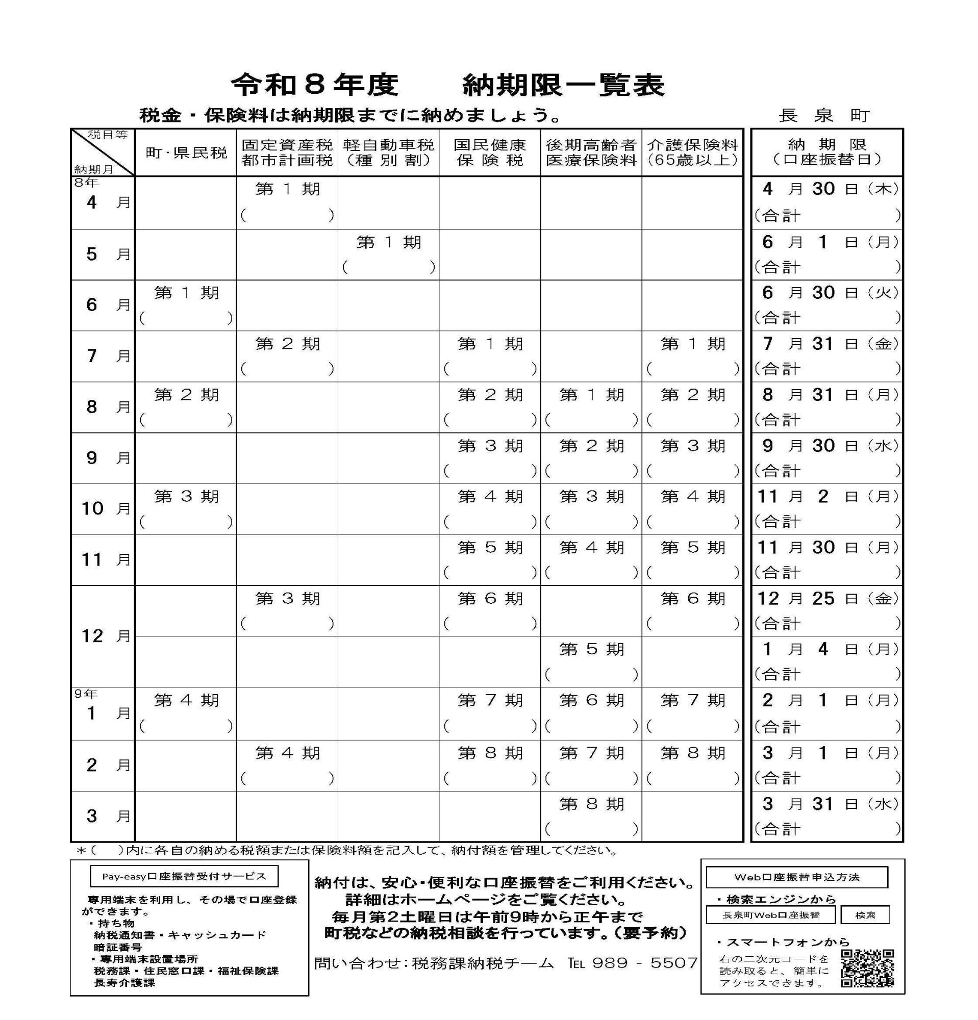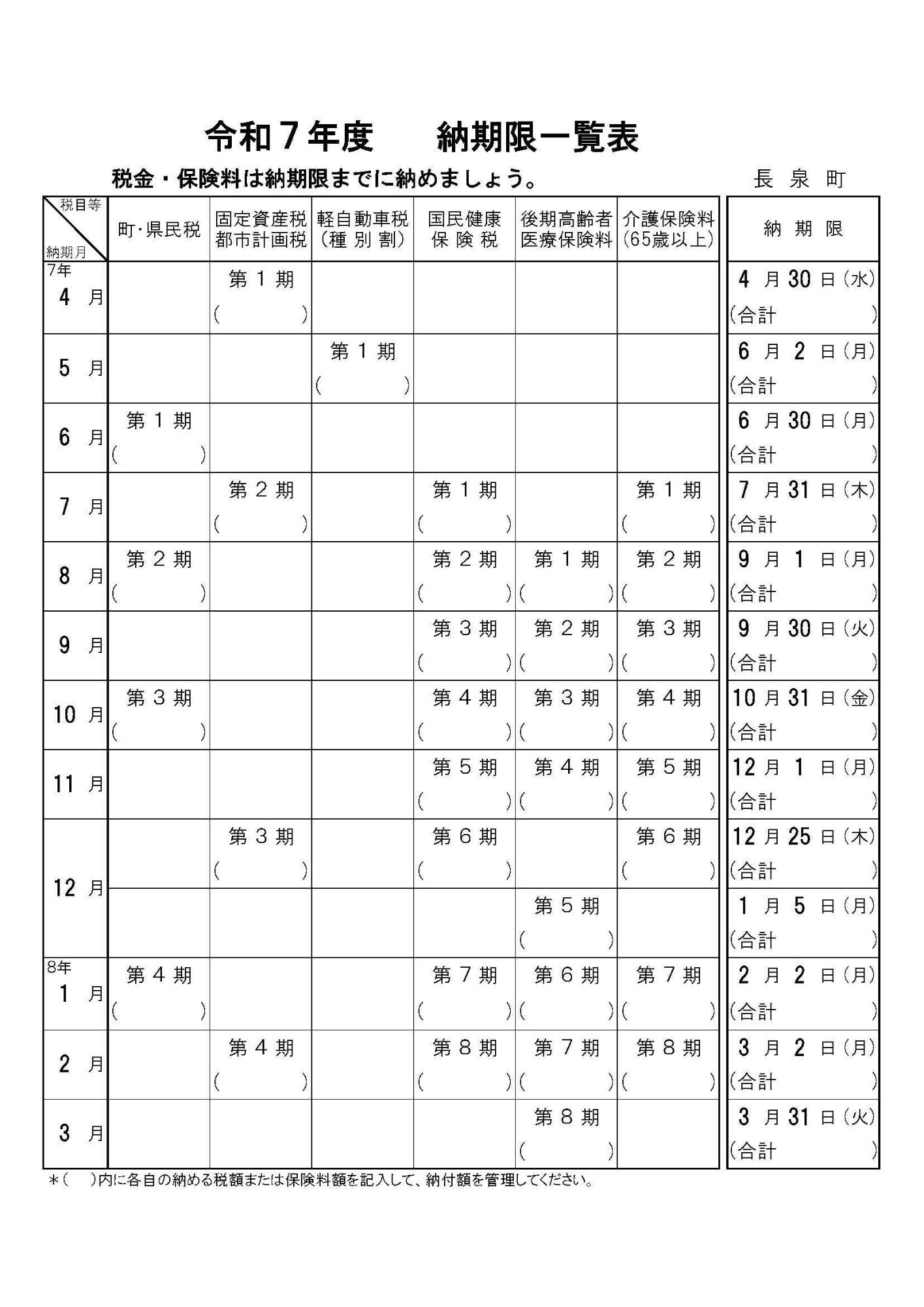 町税等納期限一覧 Tweet 更新日:2025年12月23日 令和8年度 令和8年度納期限一覧表 (PDFファイル: 154.7KB) 令和7年度 令和7年度納期限一覧表 (PDFファイル: 76.3KB) 注意 ・月末日が土曜日・日曜日・祝日の場合は、翌平日が納期限になります。(12月を除く。) ・口座振替の場合は、納期限が口座振替日になります。前日までに残高確認をお願いいたします。 この記事に関するお問い合わせ先 税務課 納税チーム〒411-8668静岡県駿東郡長泉町中土狩828 電話番号:055-989-5507 ファックス :055-989-5585お問い合わせはこちらから